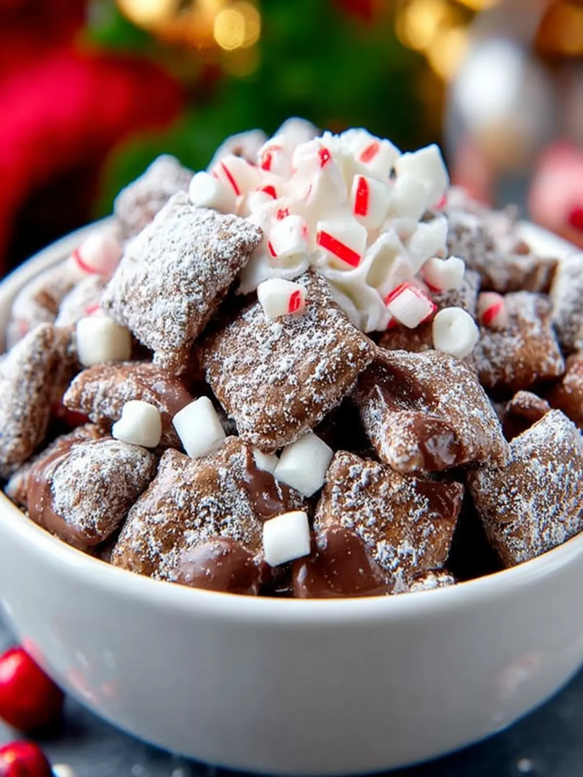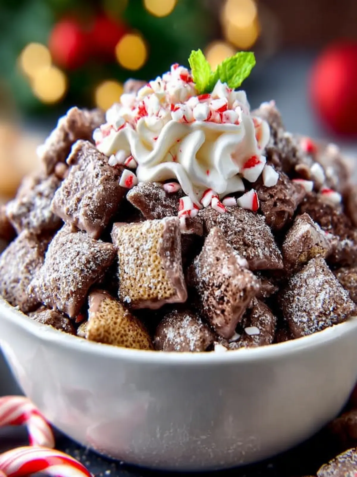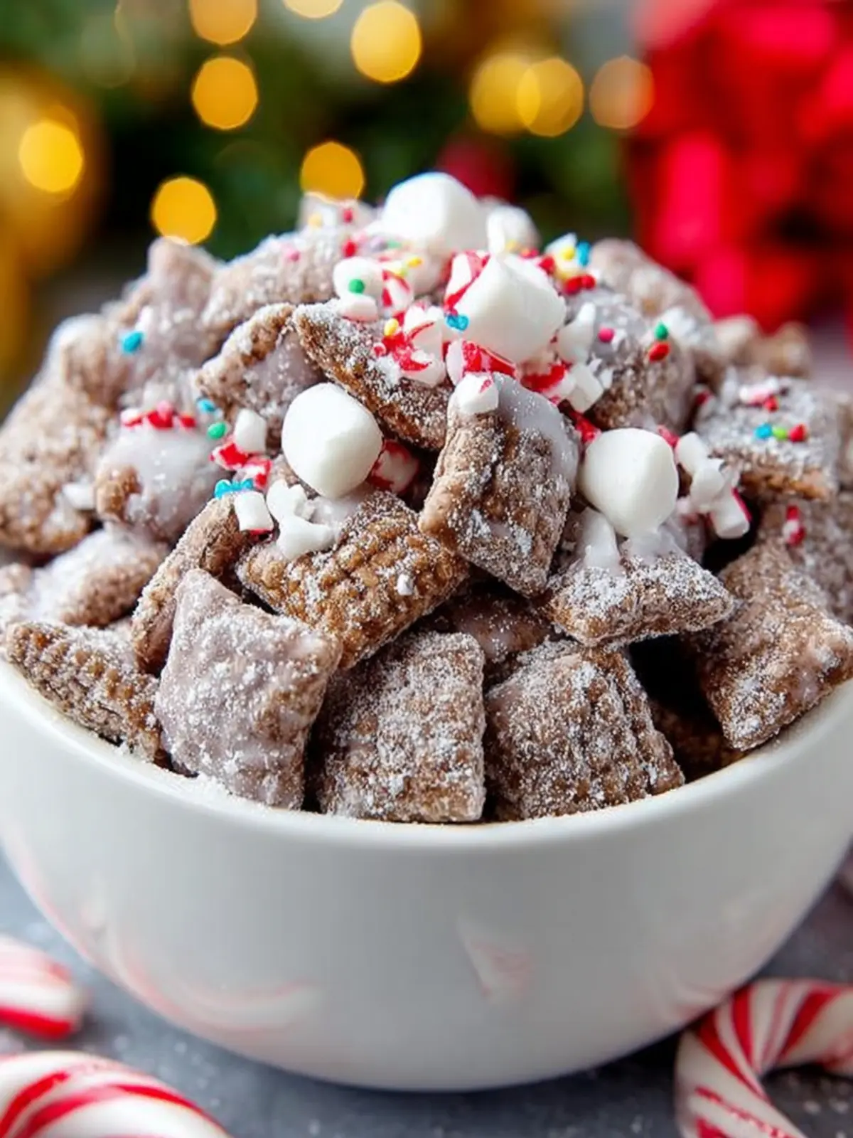 • Sprinkle Peppermint Crushed Candy Canes: Not only does this add a pop of color, but the extra crunch offers a delightful contrast to the soft texture of the chow.