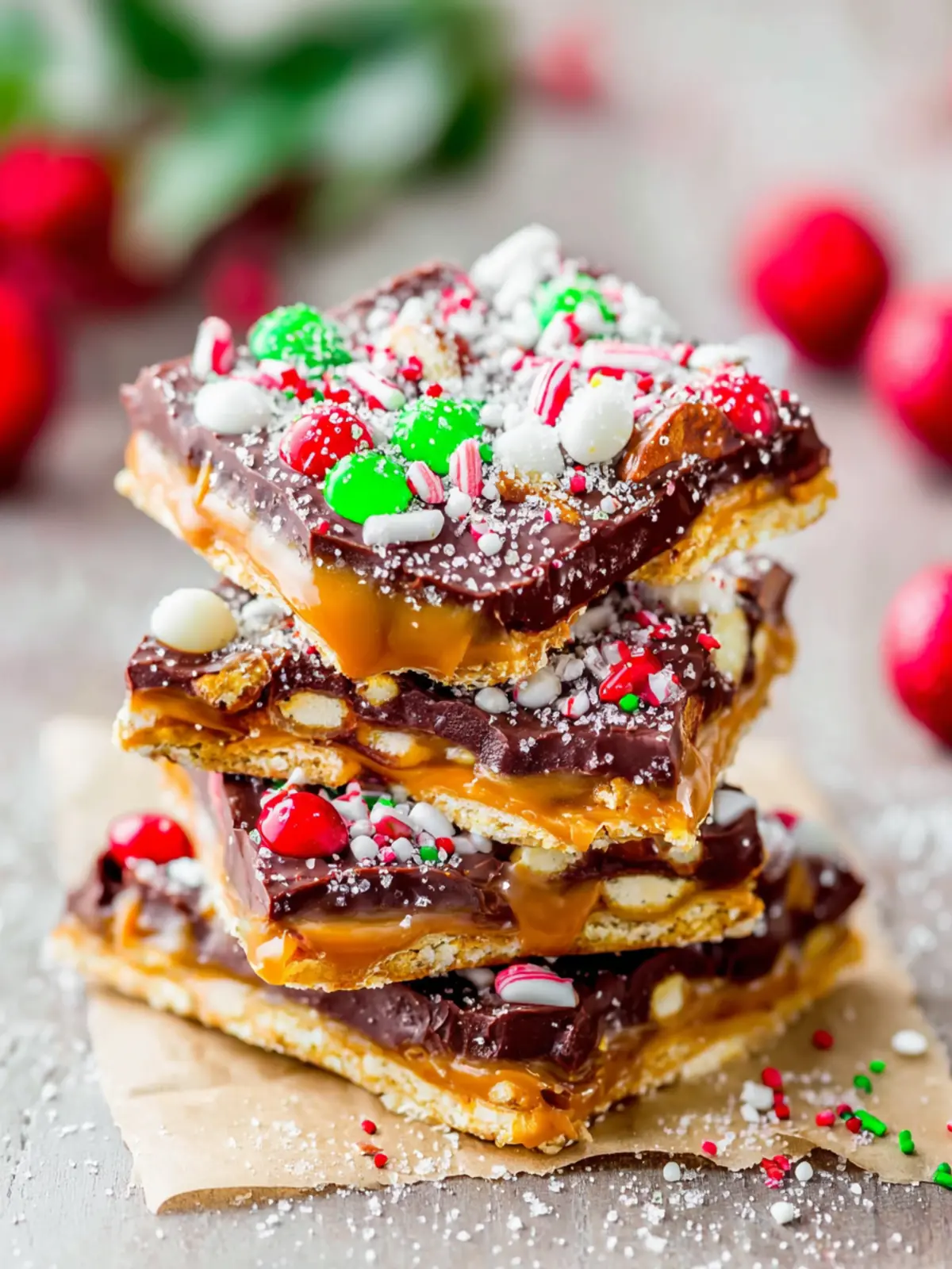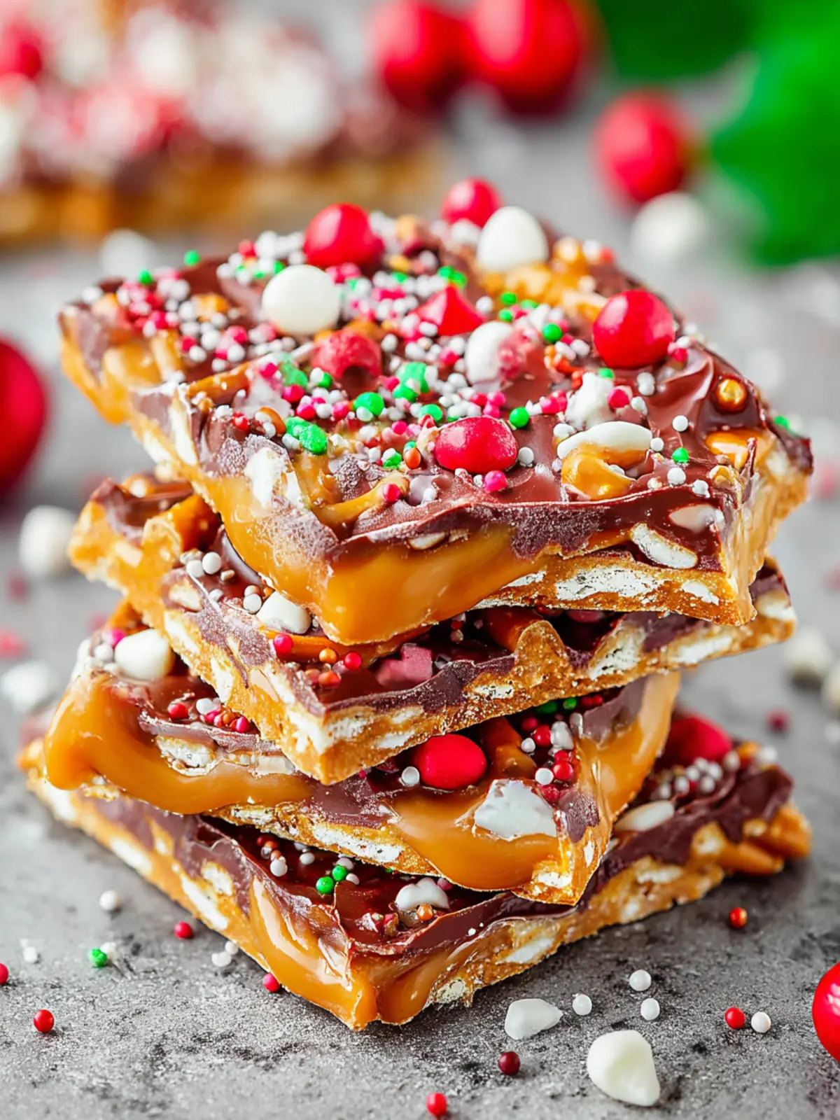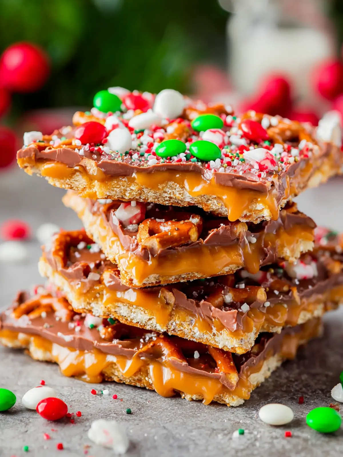 Toppings: Finish off your bark with festive sprinkles, crushed candy canes, or chopped nuts. These not only add crunch but also bring a colorful, holiday flair to your Christmas Toffee Pretzel Bark.