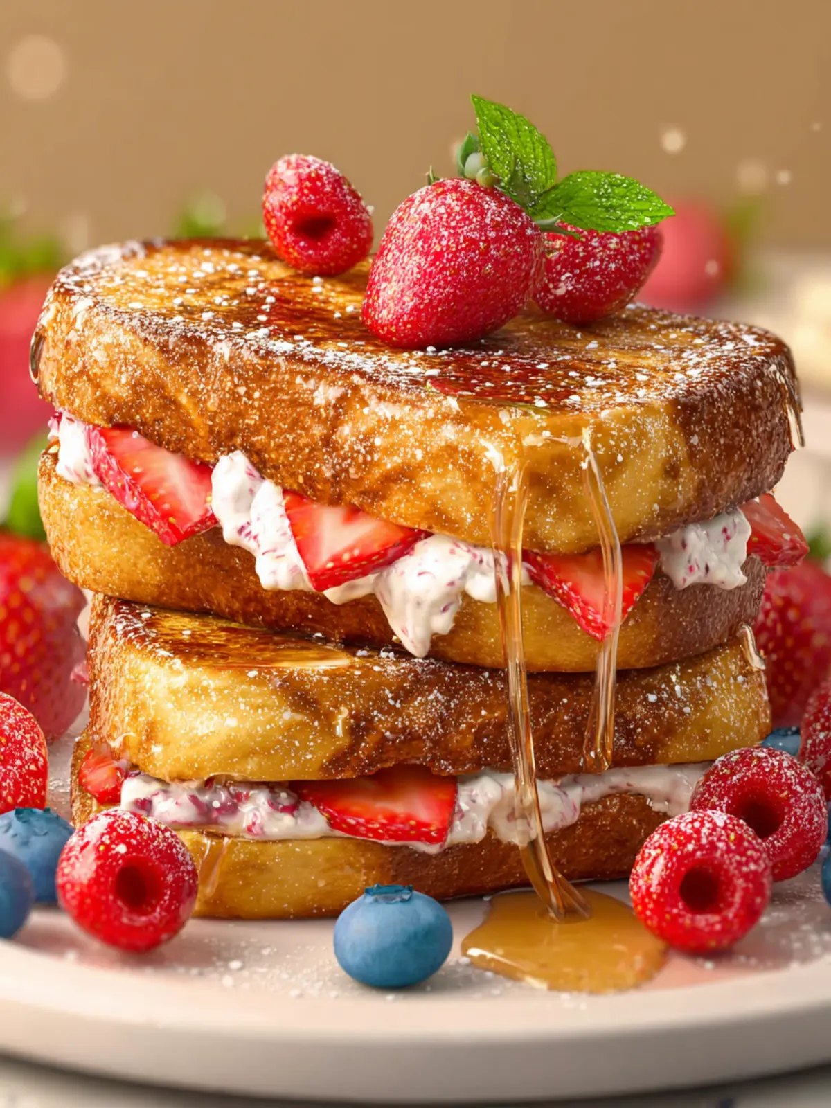 Top your cream cheese stuffed French toast with a mix of fresh berries such as strawberries, blueberries, and raspberries. Not only do they add a pop of color, but their tartness beautifully balances the richness of the cream cheese.