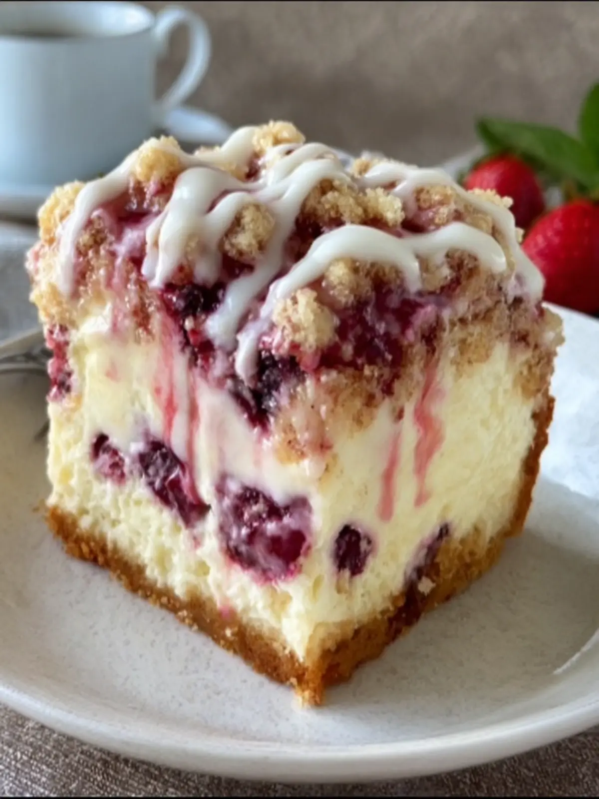 Enjoy a delightful slice of Creamy Berry Crumble Cake filled with a rich filling, fresh berries, and a crumbly topping!