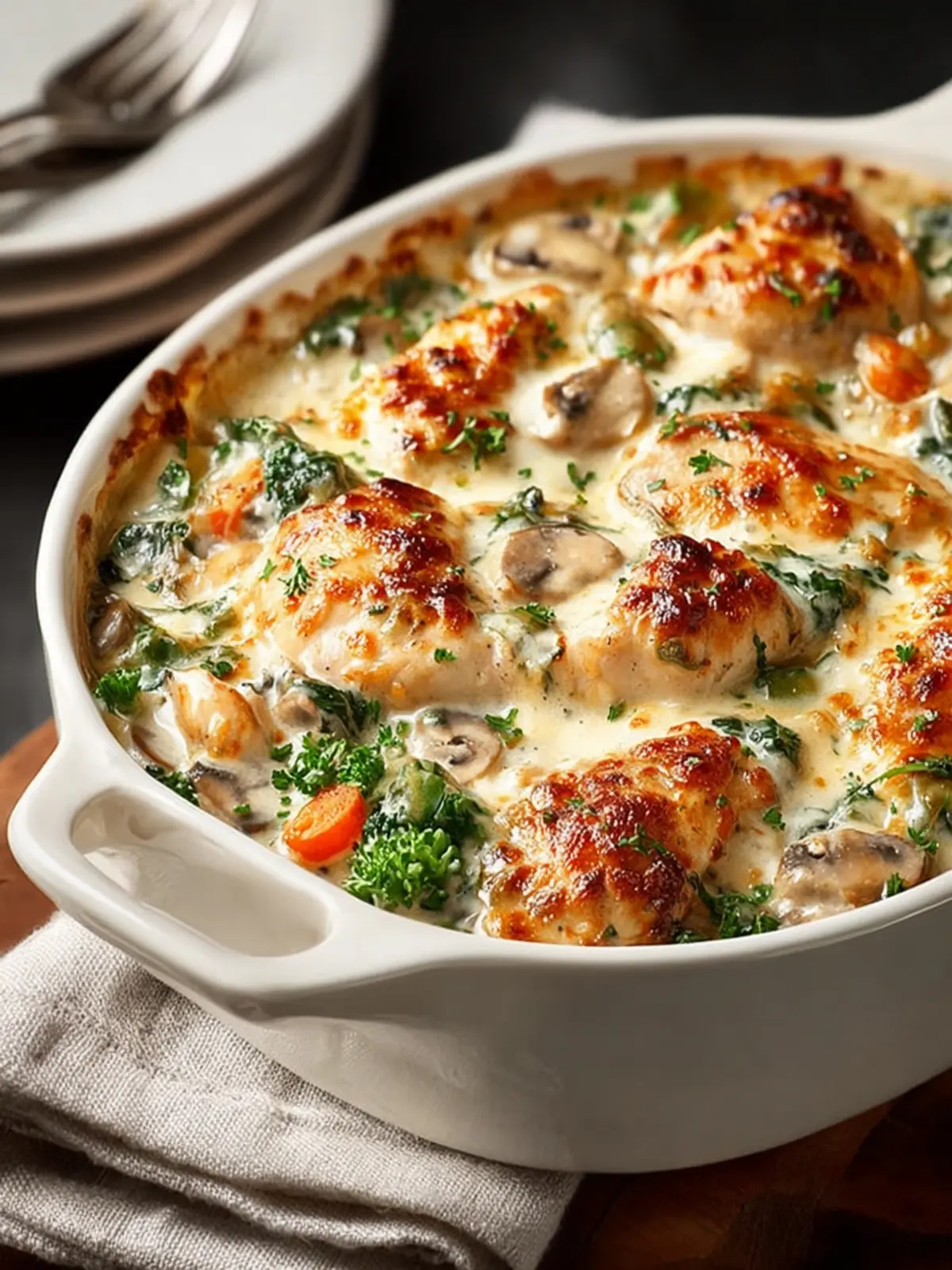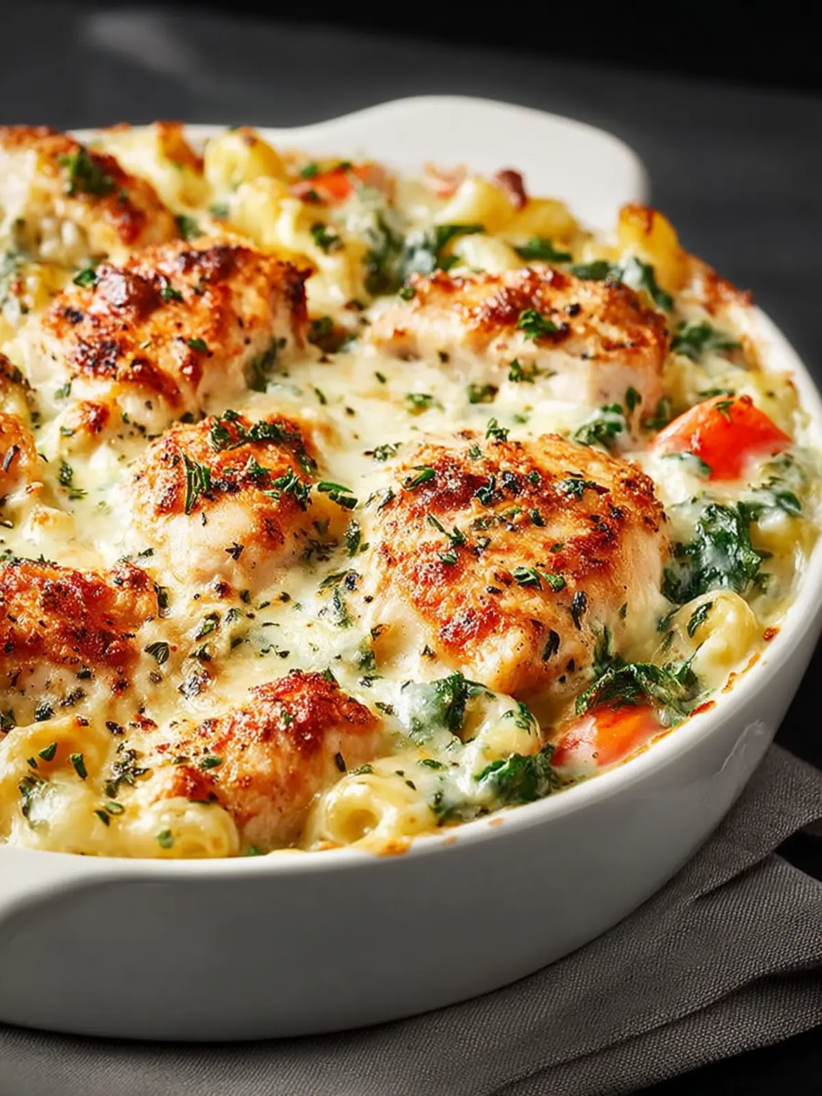 This creamy chicken and spinach casserole is a comforting dish perfect for any weeknight meal.