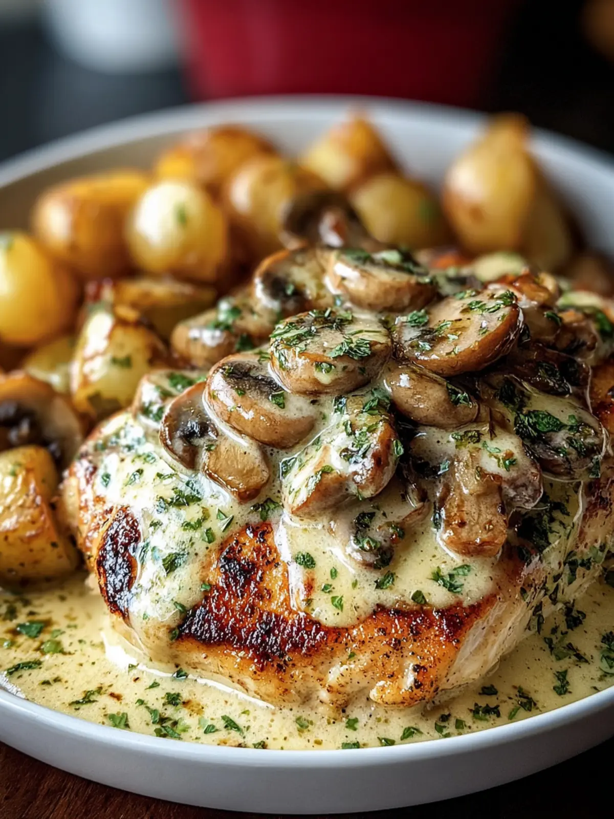 A delicious creamy mushroom chicken dish that is perfect for a comforting dinner.