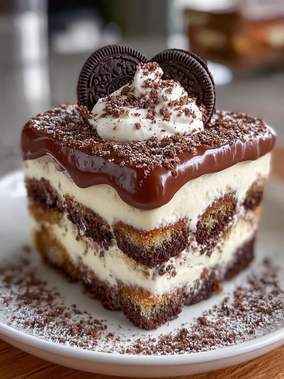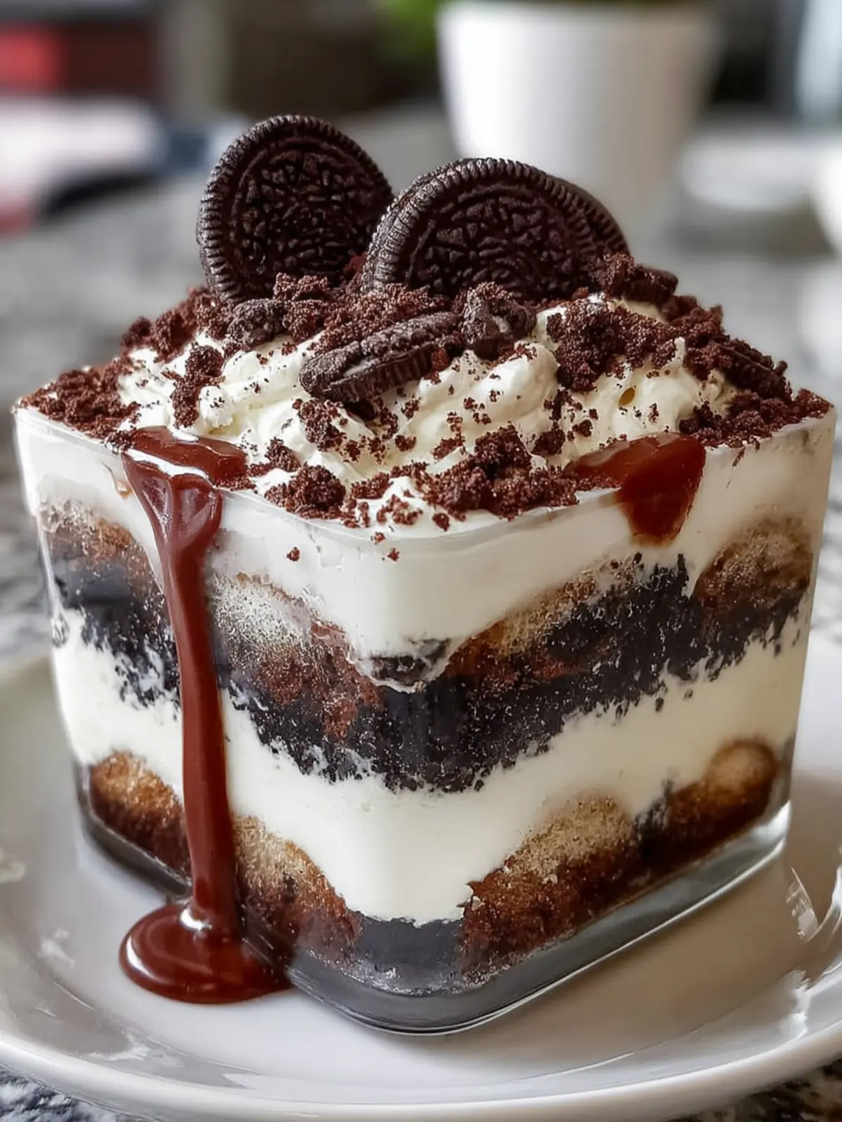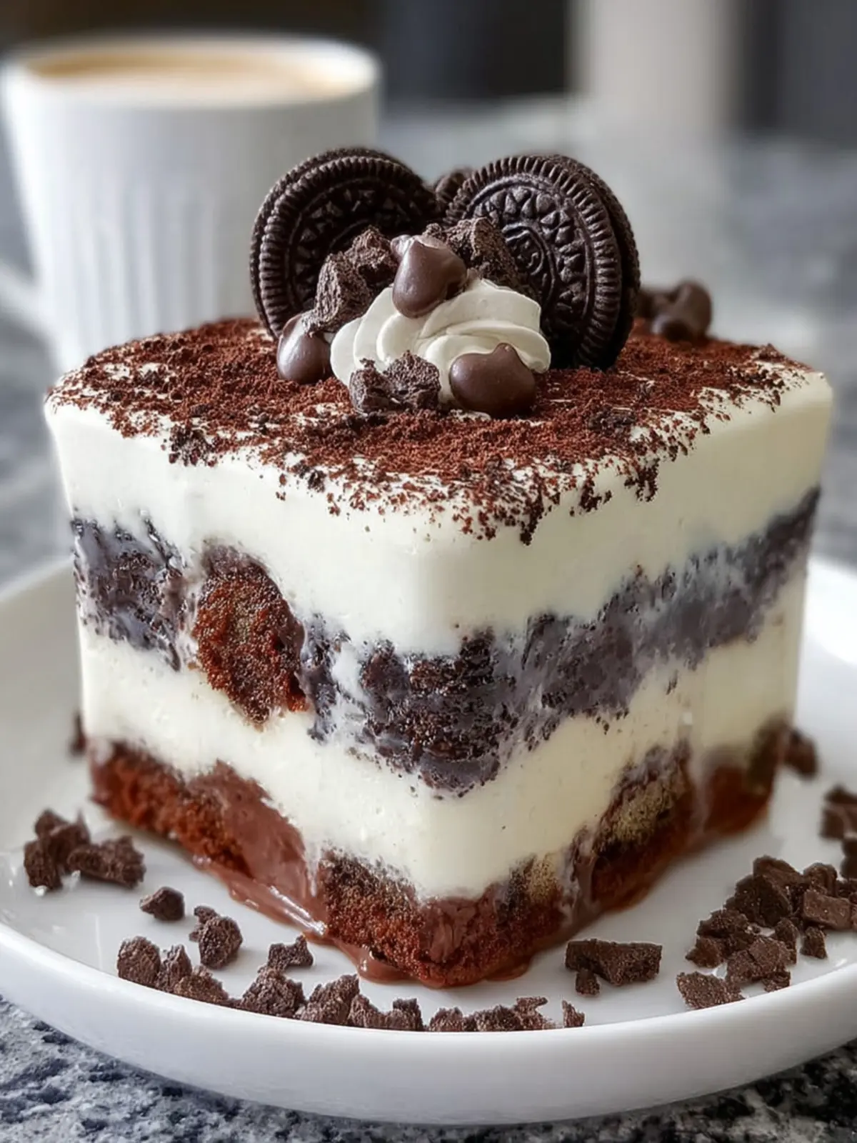 This delightful tiramisu features layers of chocolate sandwich cookies, mascarpone cream, and coffee, making it a perfect dessert for any occasion.