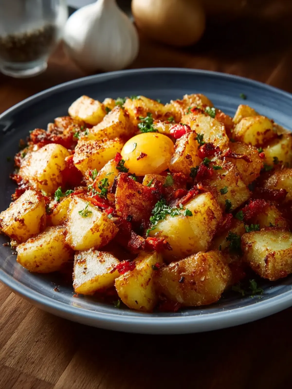 4. Season and Sauté: Sprinkle the garlic powder, paprika, salt, and pepper evenly over the potatoes. Stir in the chopped onion. Continue cooking, stirring occasionally, until the potatoes are golden and crispy—about 10–15 minutes.