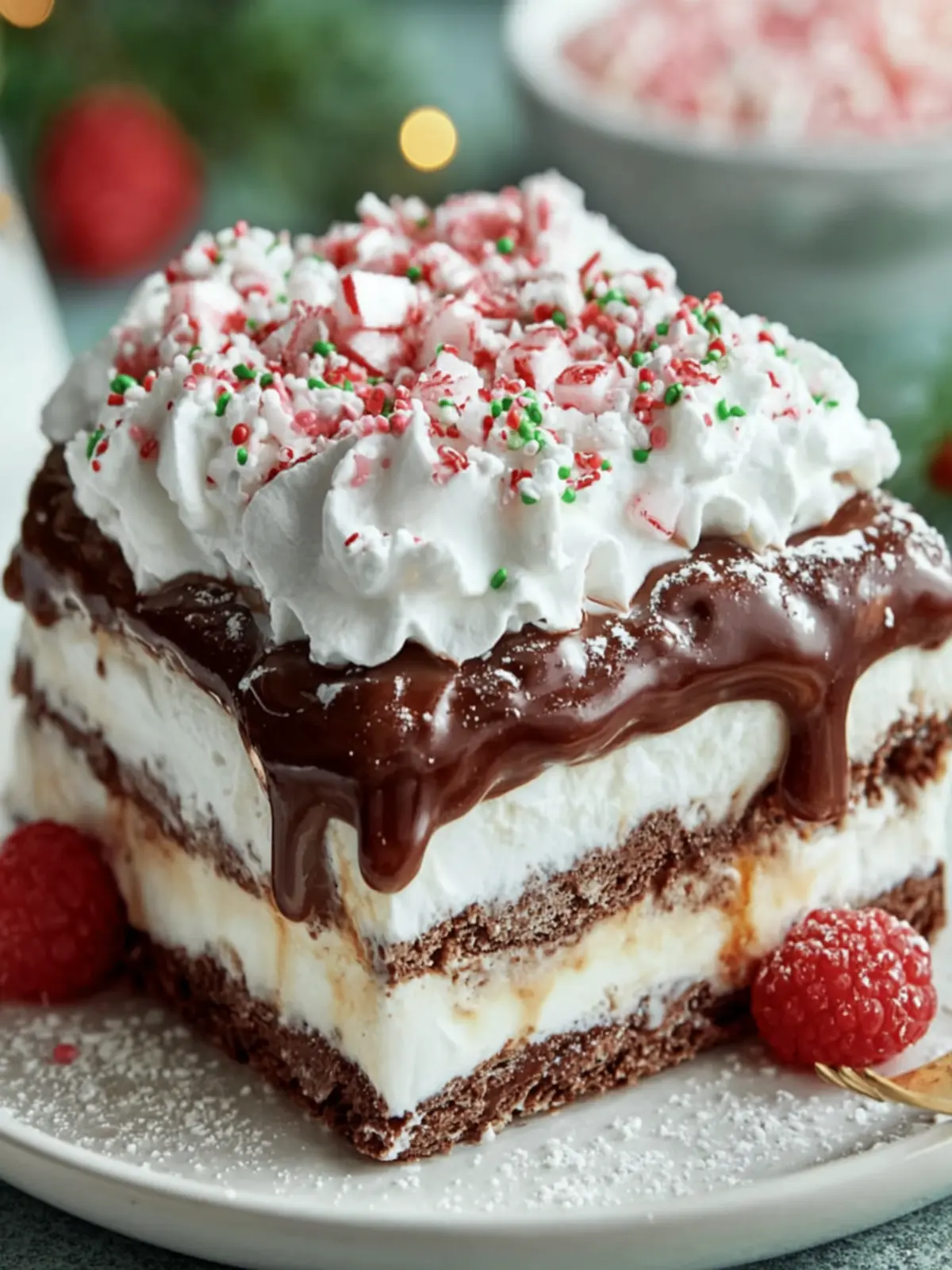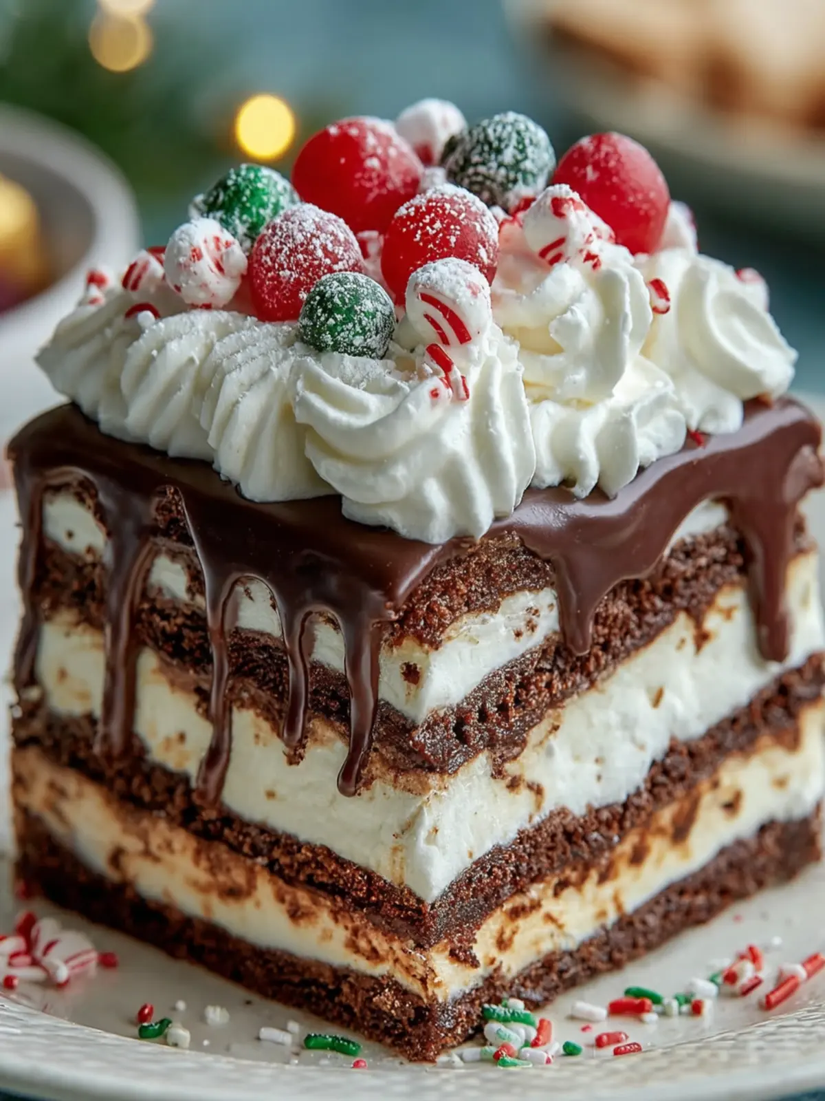 A deliciously rich dessert featuring layers of chocolate wafer cookies and whipped cream, perfect for festive gatherings.