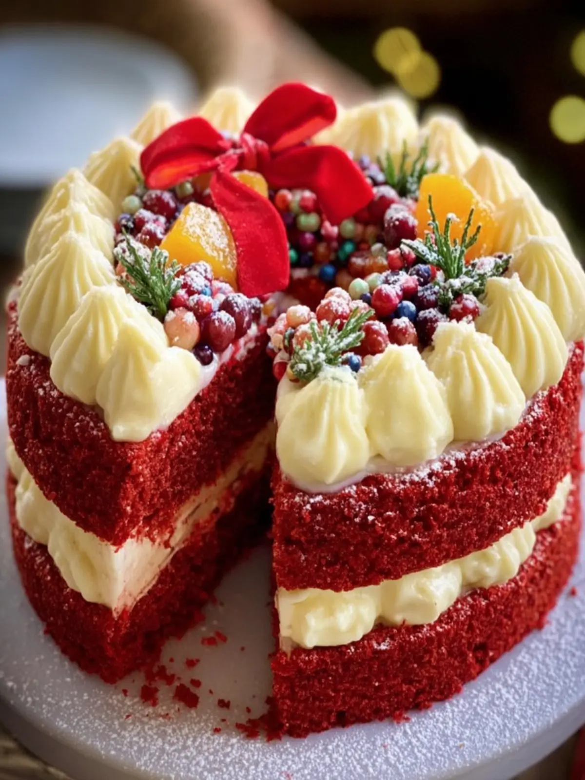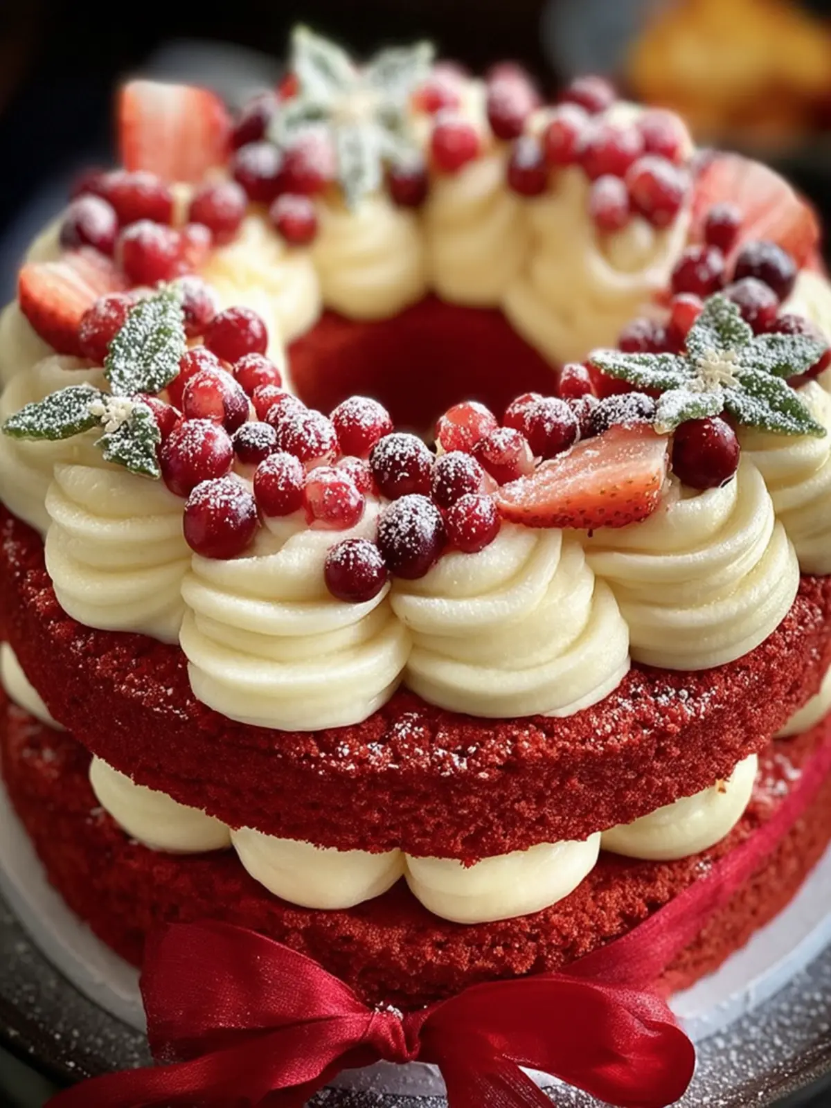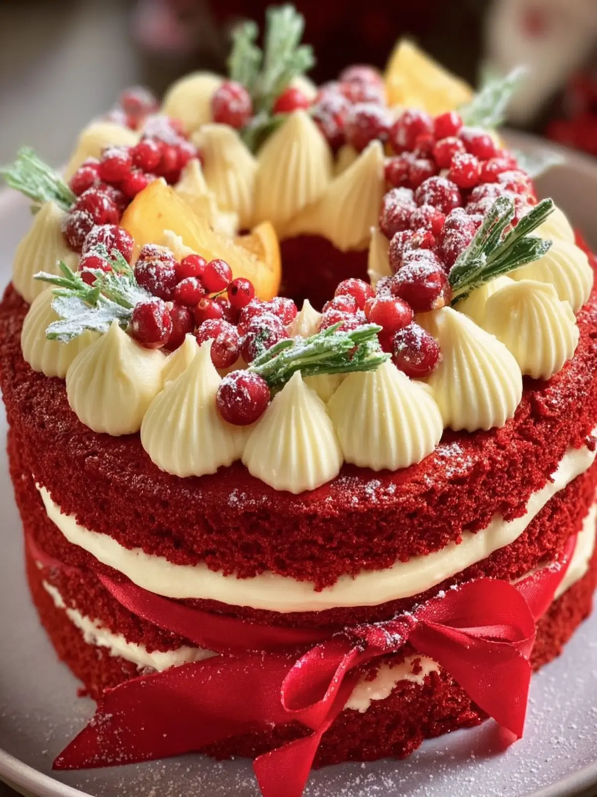 A delicious and festive red velvet cake perfect for holiday celebrations.