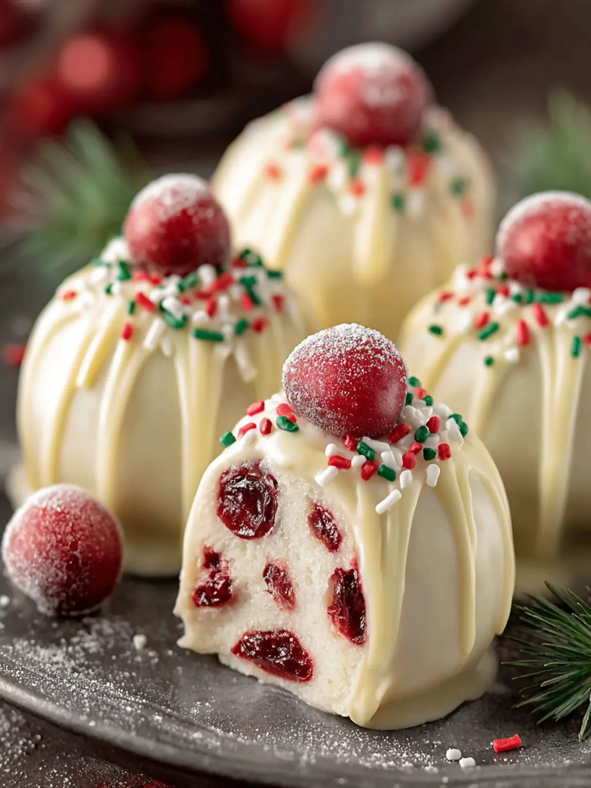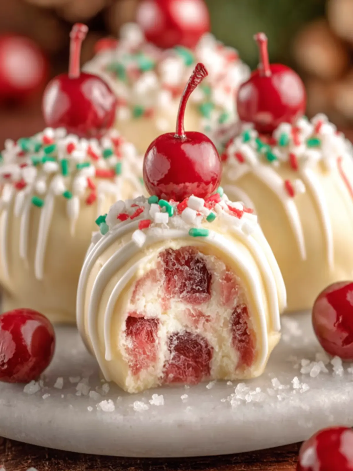 Delicious and festive cherry cake balls coated in white chocolate, perfect for the holidays!