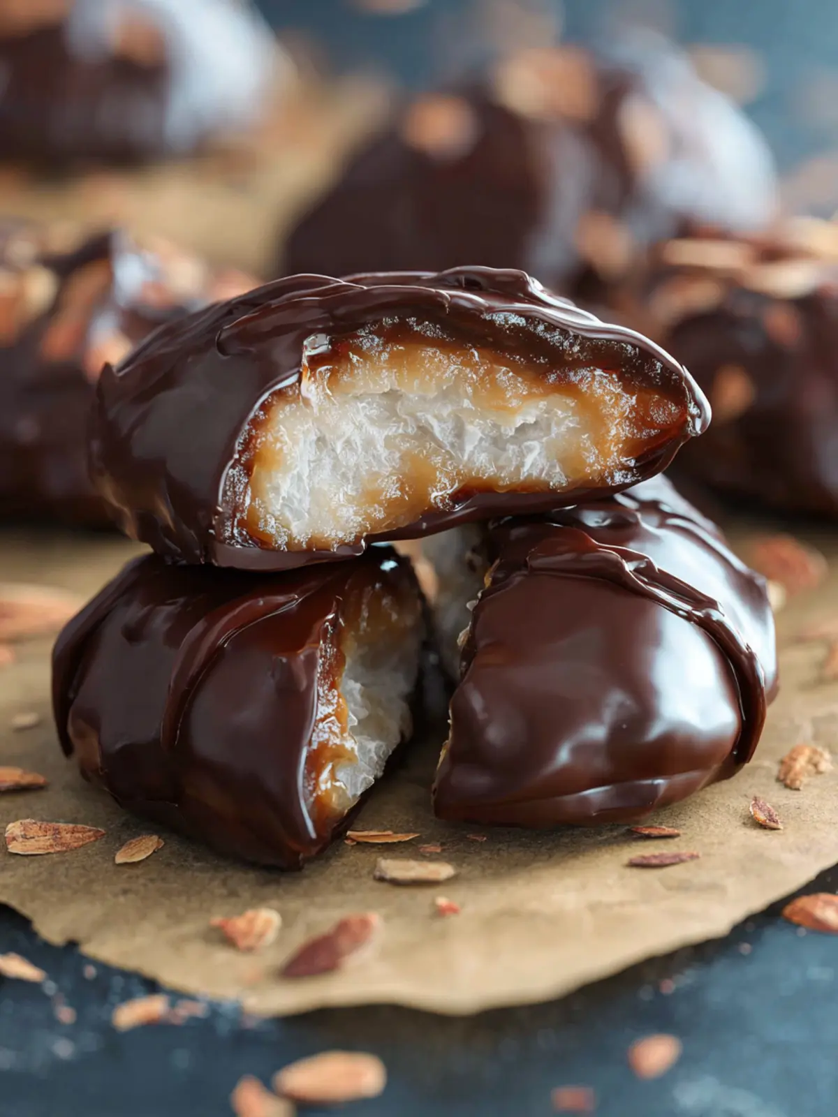 Delicious chocolate-covered treats made with marshmallows, coconut, and almonds.