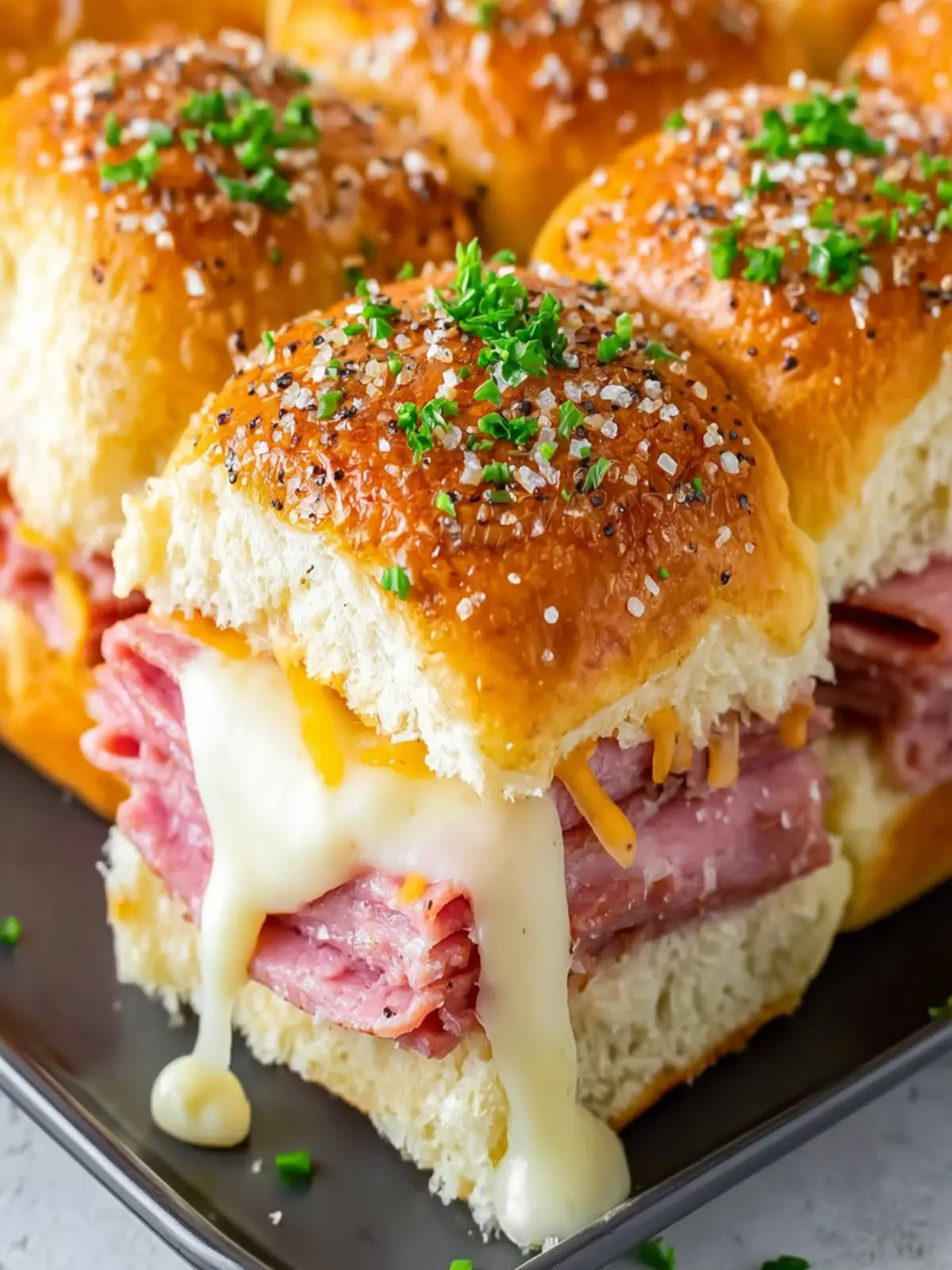 • Melted Cheese: A generous layer of cheese isn’t just a garnish; it’s the heart of these sliders. Whether you choose classic Swiss, sharp cheddar, or gooey mozzarella, the melting cheese envelops the ham, making every mouthful irresistible.