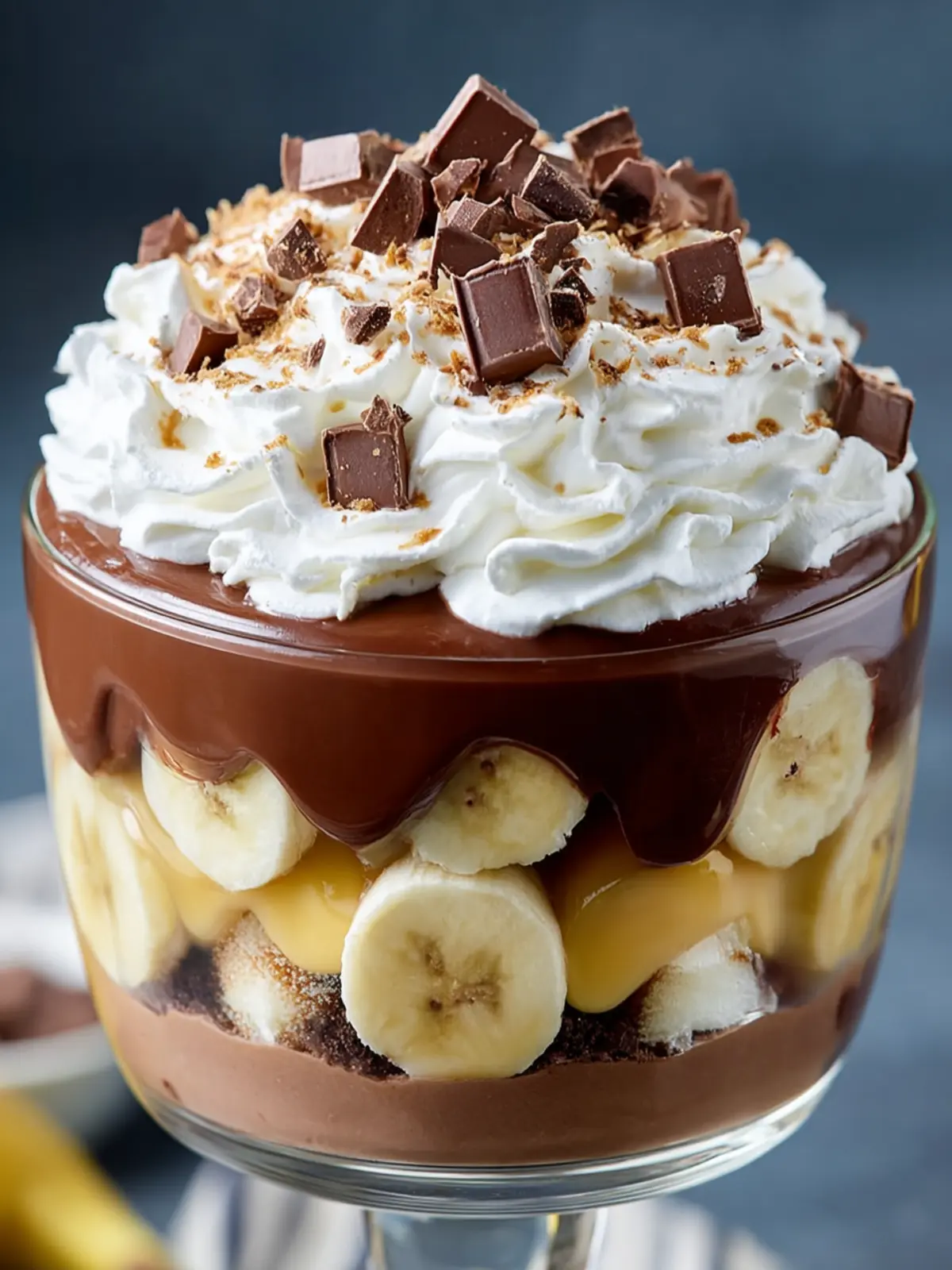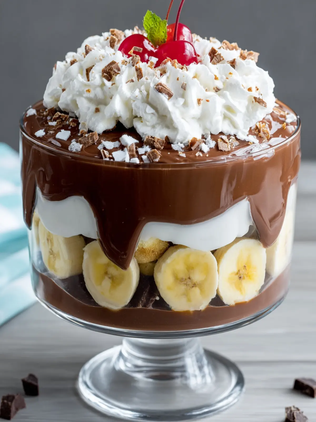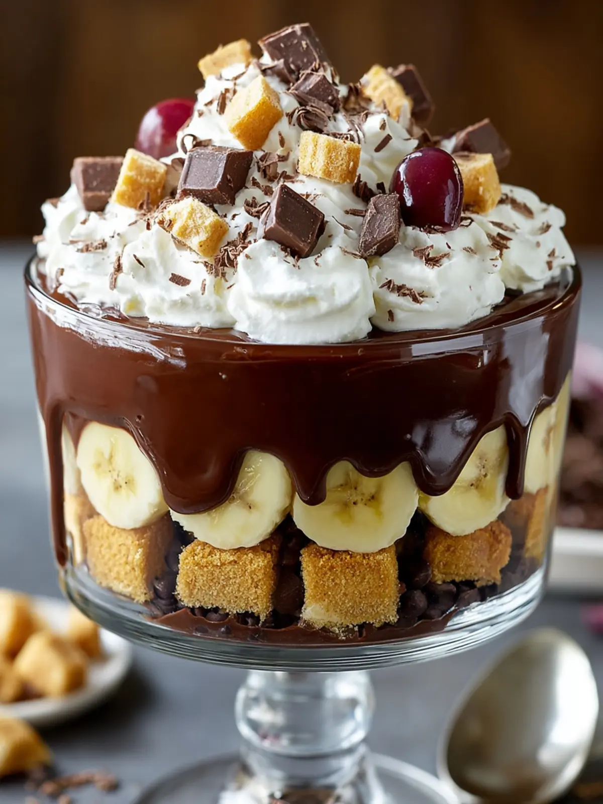 A delicious layered trifle dessert featuring chocolate pudding, bananas, whipped cream, and chocolate cake.