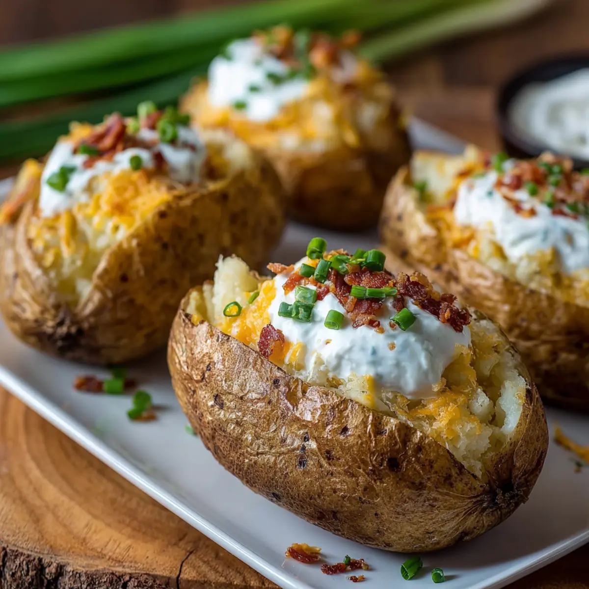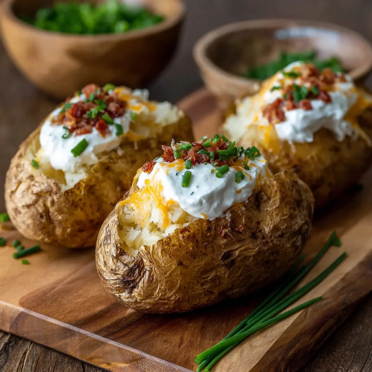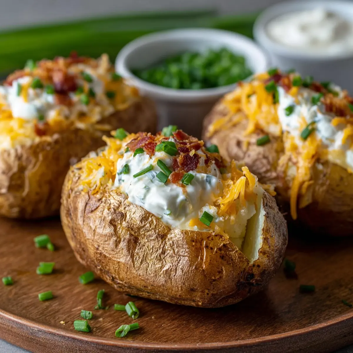 Delicious loaded baked potatoes topped with sour cream, cheese, bacon, and chives.