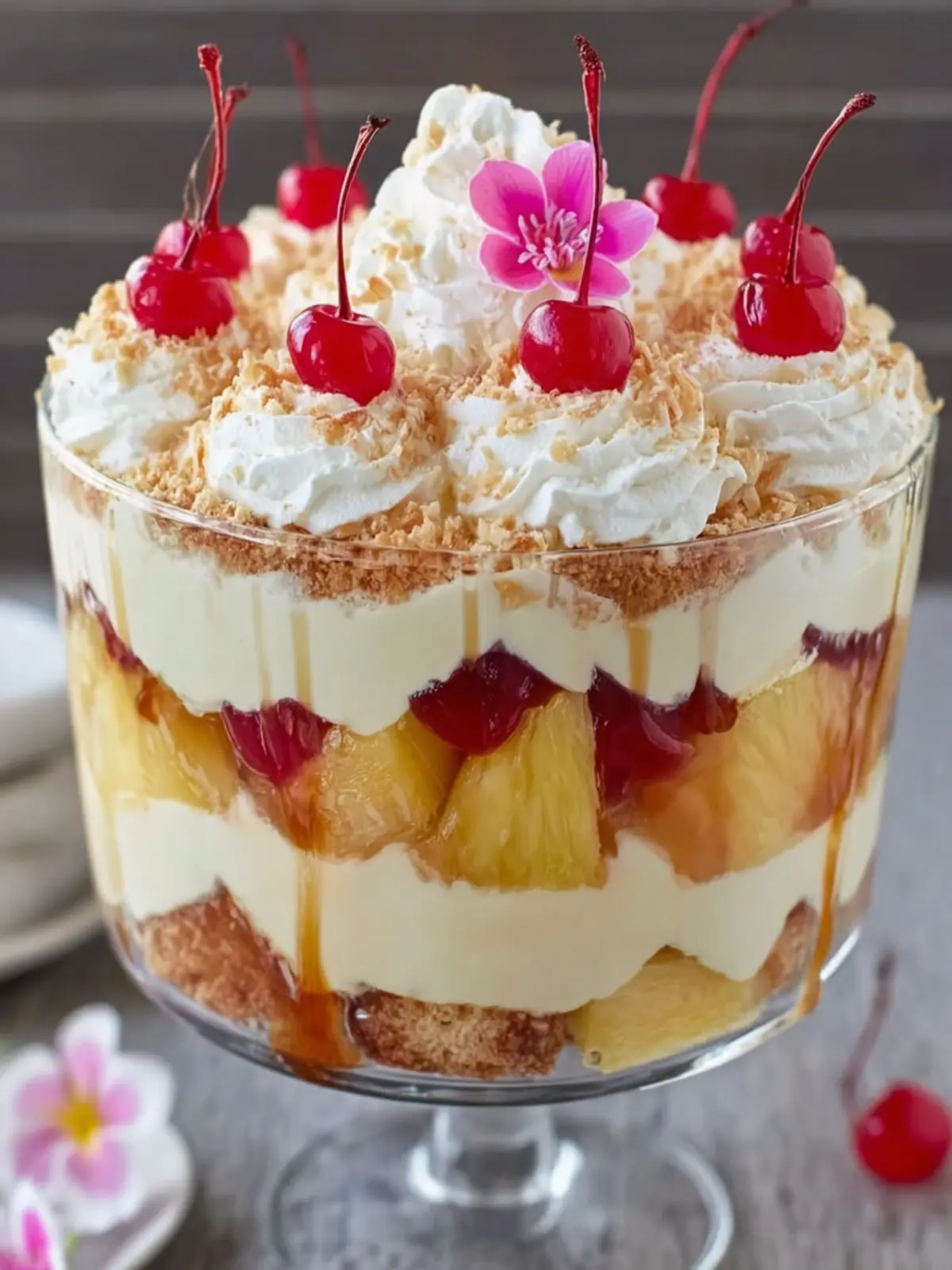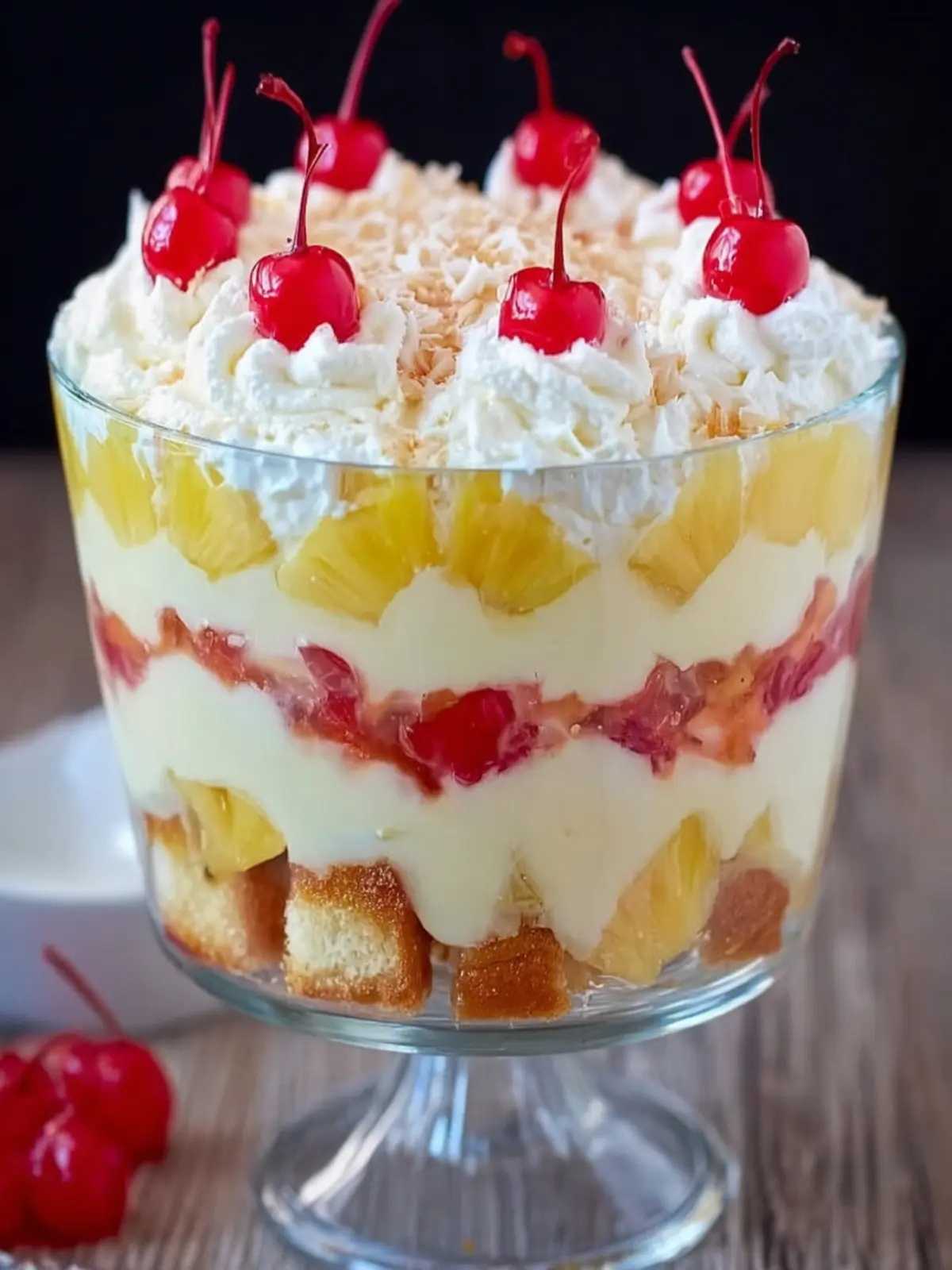 - Garnish: Arrange maraschino cherries on top of the final layer of whipped cream. Sprinkle more toasted coconut if desired.
