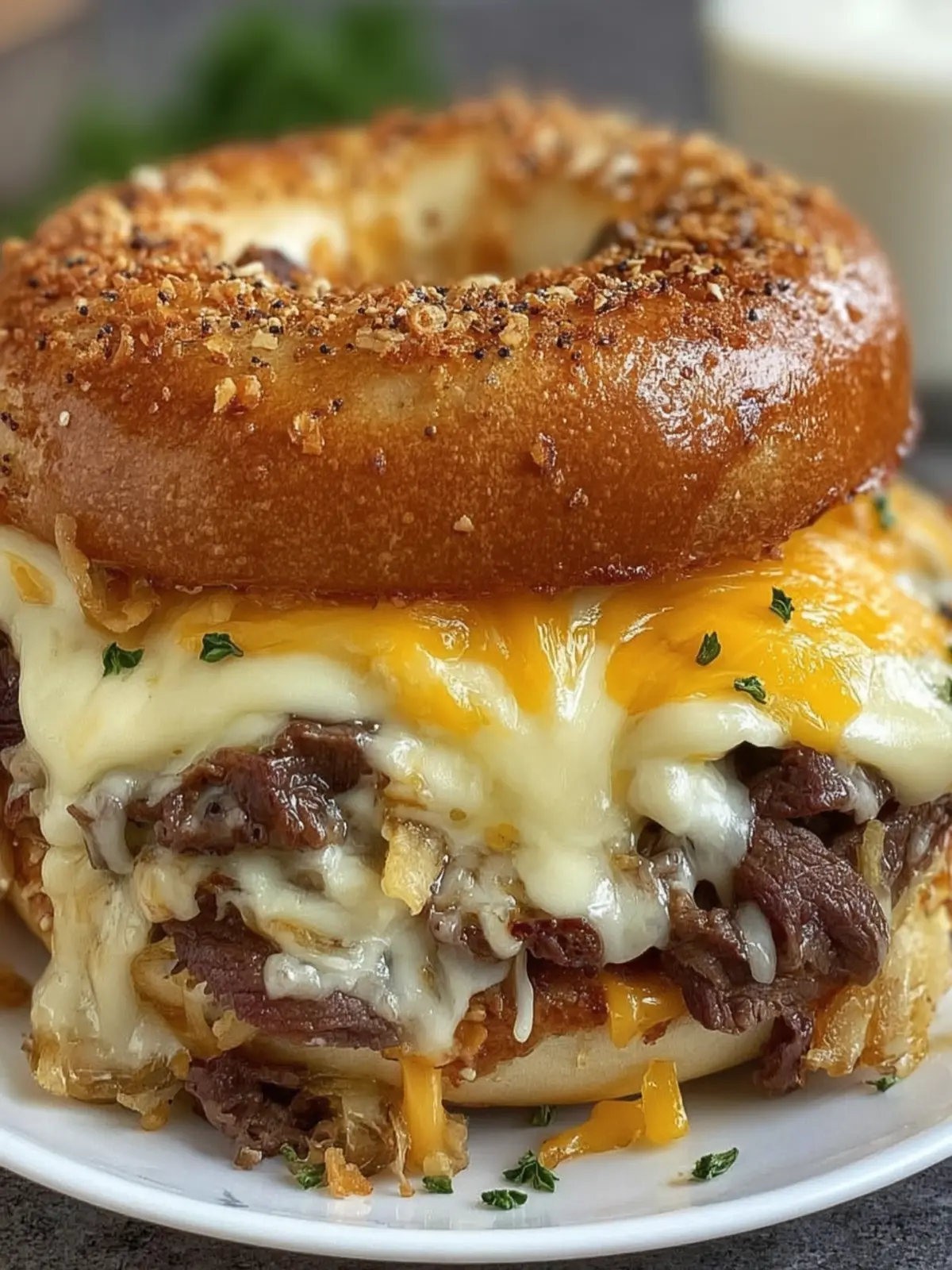 Delicious and hearty Philly cheesesteak bagel sandwich with melted cheese and sautéed vegetables.