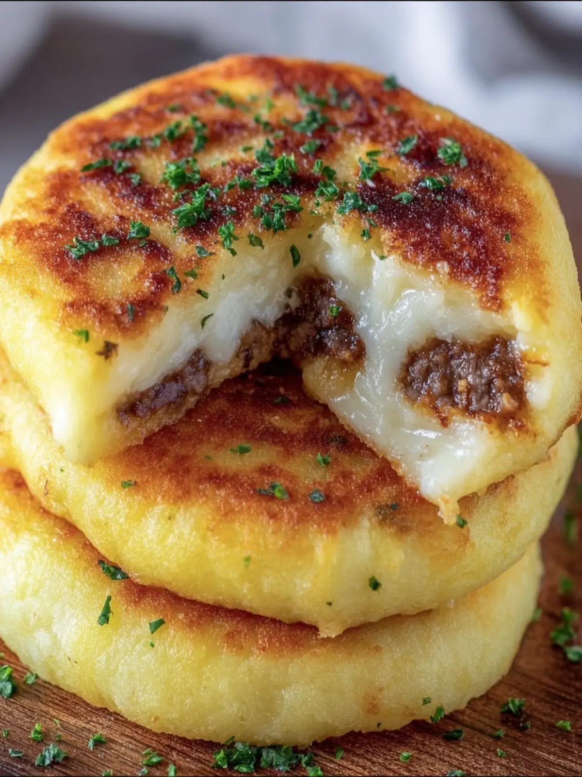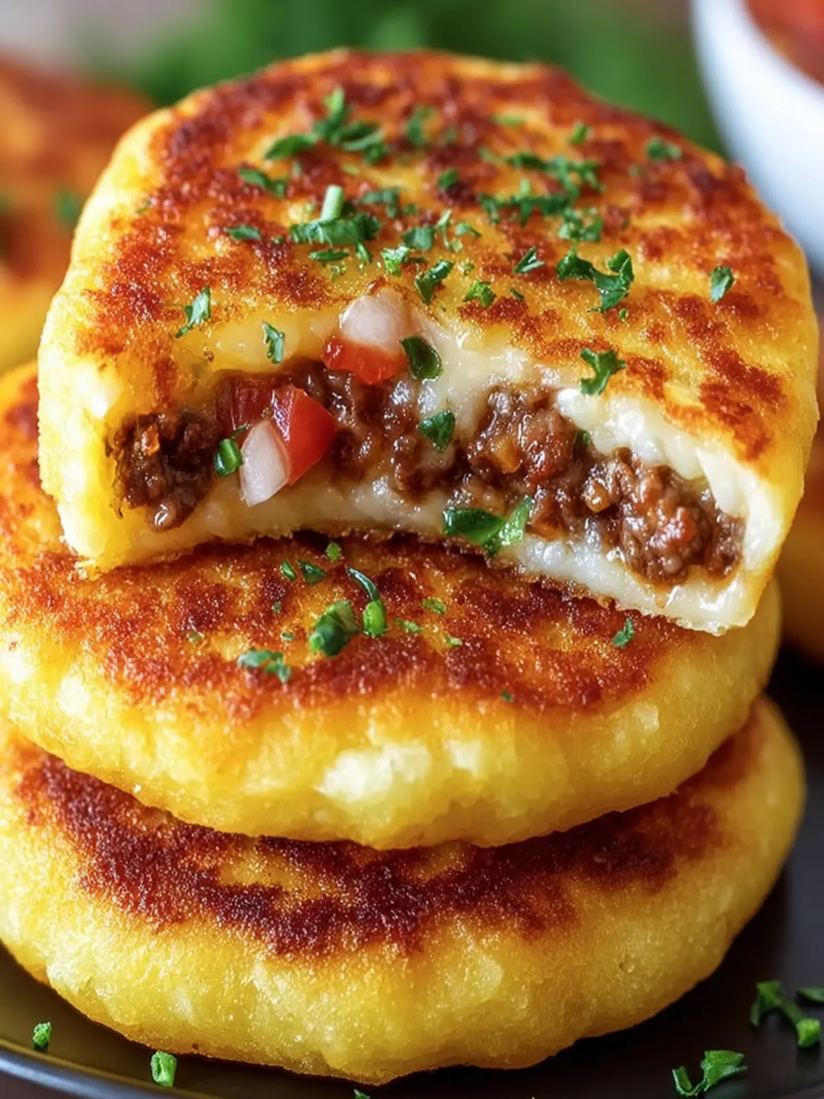 Delicious and hearty savory stuffed potato cakes filled with seasoned ground beef and onions.
